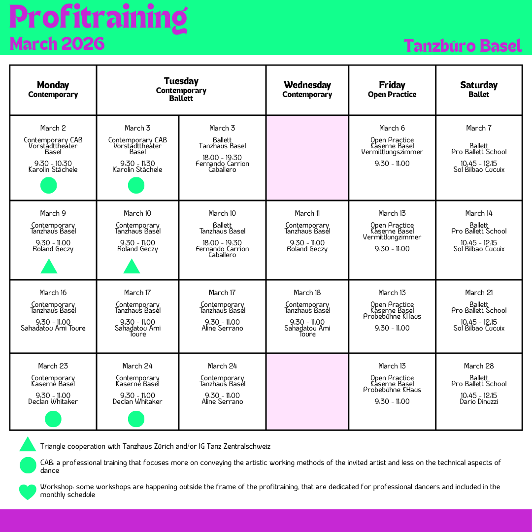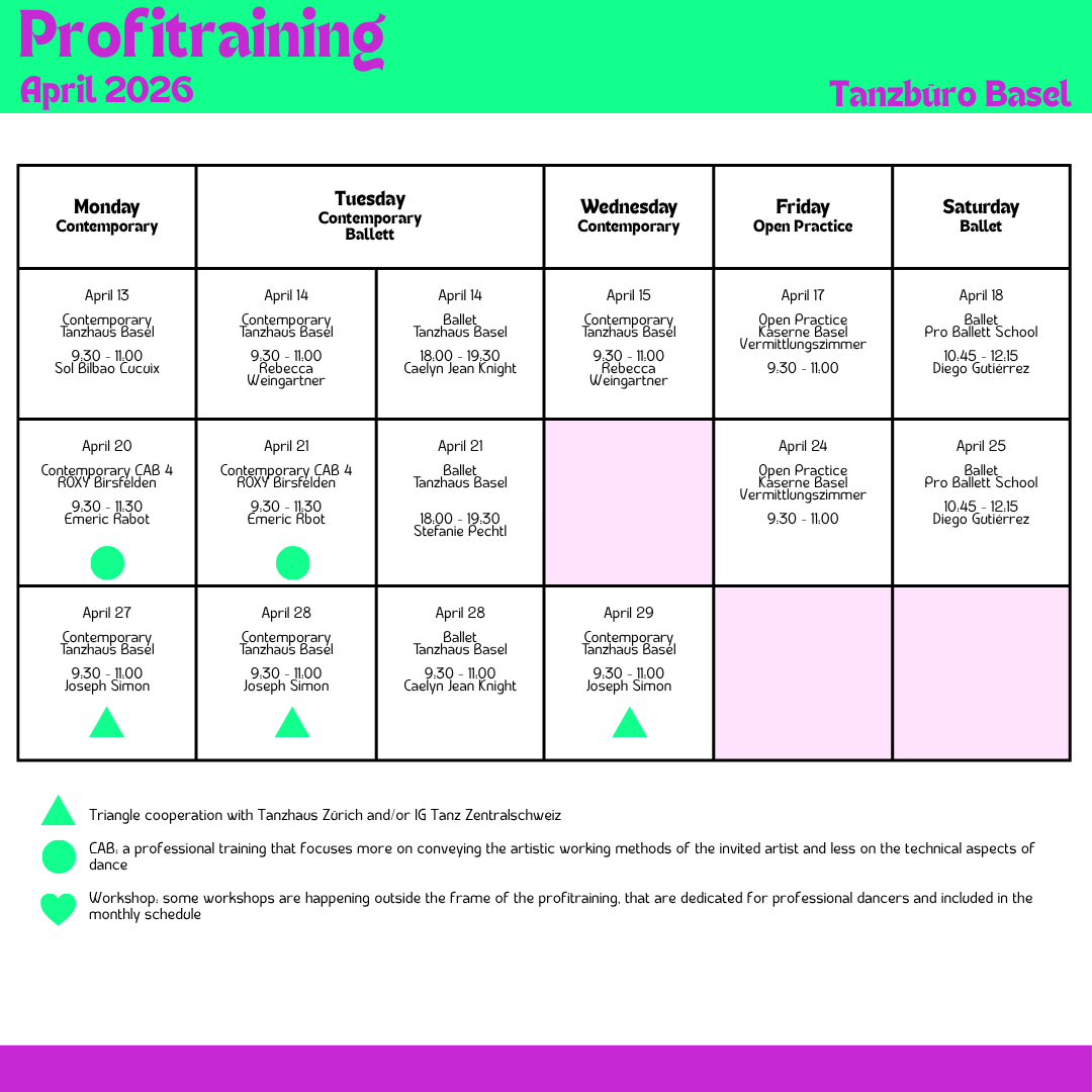 The contemporary professional training will take place weekly from January 2026 on Mondays, Tuesdays, and Wednesdays from 9:30–11:00 a.m. at Tanzhaus Basel. Regular school holidays and public holidays are excluded.